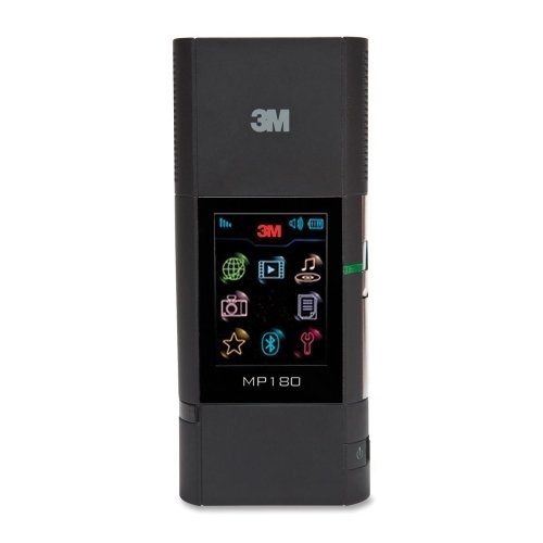 3M Commercial Office Supply Div. Pocket Projector, 4GB, 2-1/2"x6"x1-1/3", BlackPocketProjector MP180 provides great versatility as the ultimate in portable projection technology. Simply plug the mini projector into your digital media device and watch videos, photos and games come alive with images up to 80" in size and 32 lumens of brightness. Ideal for projecting files, charts and spreadsheets. Never leave a file behind with 4GB of internal memory and microSD card compatibility. Use Bluetooth or USB to transfer files in a few clicks. The MP180 even has Wi-Fi if you need to grab a file or browse the web on the go. Projector is fully equipped with an LED light source, two .75W speakers, two hours of battery life, a 3.5mm stereo jack and SVGA resolution (800 x 600). PocketProjector MP180 connects to virtually any gadget - computer, cell phone, iPod/iPhone or PDA to share files, photos and movies virtually anywhere. Projector includes a battery, wall charger, charger adapters, USB and computer cables, composite video cable (RCA), tripod, and soft protective pouch.