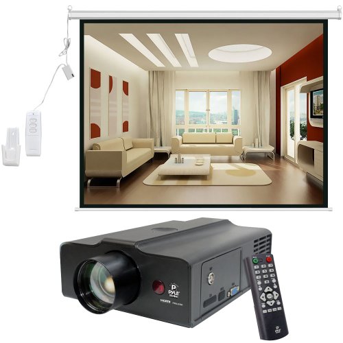 Pyle Video Projector and Screen Package - PRJLE60 Portable LED Projector for Gaming TV Shows Movies and Sports at Up To 100 Inches - PRJSER1410 100'' (60''Hx80''W) Motorized w/Wireless Remote Projector Standard Format (4:3) Screen - For Home, School, Office, Business, Meetings and Presentations etc.
